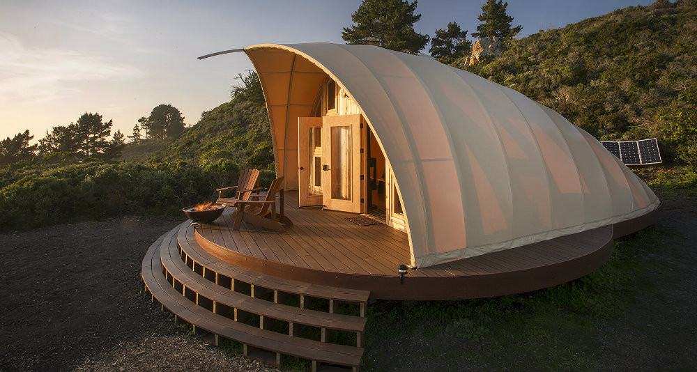 Ranging from 350 to 650 square feet and starting at about $100,000, each tent has a steel or aluminum frame and are sheathed in a high-tech fabric not unlike the terminal’s cladding at Denver International Airport. Designs can feature solar and wind power, graywater systems, custom interiors, and indoor fireplaces and outdoor firepits.