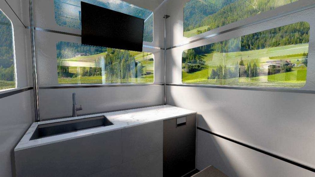 That led to a collapsible design — the CyberLandr retracts into the pickup bed on the road — along with retractable solar panels, an automatic door, and induction cooktop. The shell is largely made of advanced composites, and the interior features a bedroom, living room, bathroom, and kitchen.