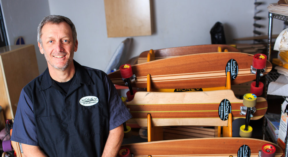 The company offers nearly 20 varieties of boards. By using different layering techniques, including vertical laminated cores like those found in skis or snowboards, Honey’s boards can be designed for cruising down a windy mountain road or through city streets.