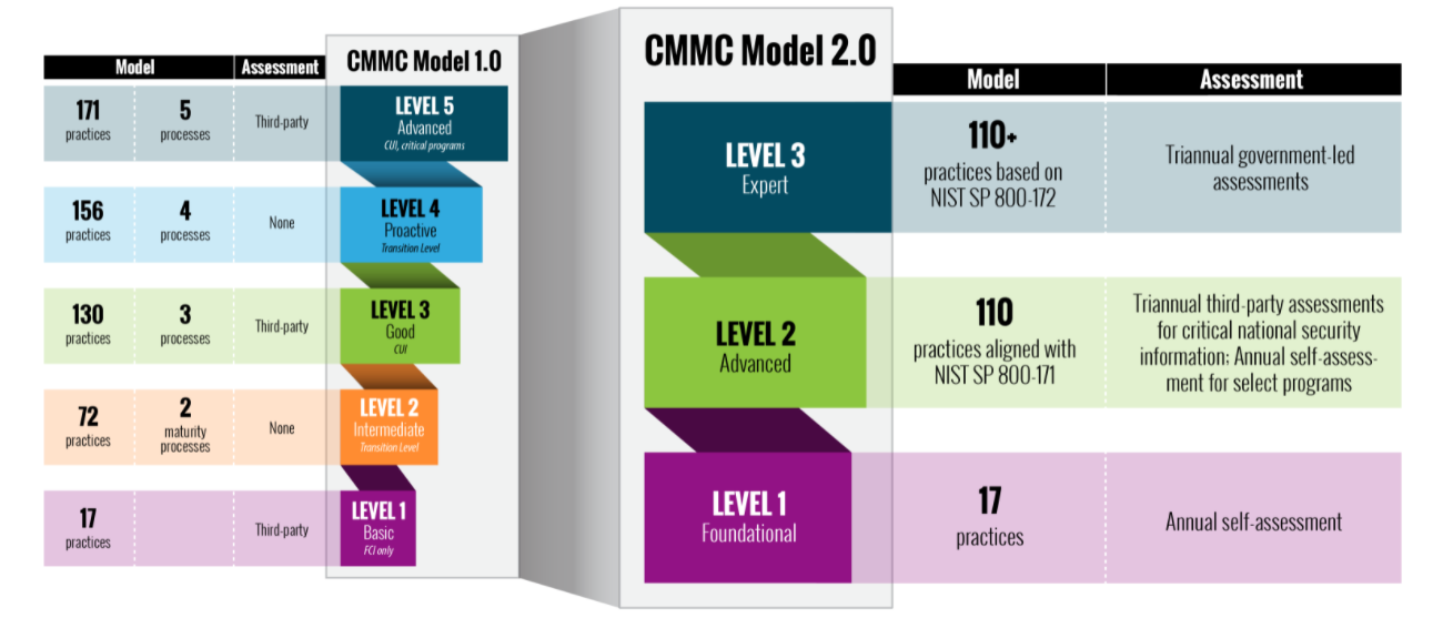 One of the changes is to reduce the number of Levels in the CMMC framework; CMMC 1.0 had five levels, but 2.0 has three levels: foundational, advanced, and expert. The two levels dropped from CMMC 1.0 were inconsequential; D.C. logic can only describe why these levels were created in the first place.