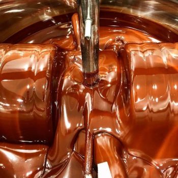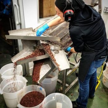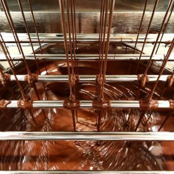 Next the beans are run through an impact cracker. Then the shells are separated from the valued cacao nibs, using a winnowing machine. Menkes grinds down the nibs using a melanger, which has two stone wheels, sometimes adding cocoa butter (depending on the percentage already found in the nibs) and then sugar, over the course of a few days. The liquid that’s formed is conched using heat and air, so that the vinegary aroma resulting from the beans’ original fermentation dissipates. Then the liquid’s filtered through a mesh sieve to remove any stray shell particles or remaining granules of sugar. After cooling overnight, blocks of cacao are hermetically sealed and aged for a month, to drive off more of the acetic acids.