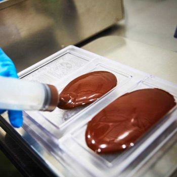 After the requisite amount of aging, Menkes melts the block of cacao down over the course of 14 hours. Then the chocolate is placed in a tempering machine, which, through heating and cooling, adjusts the internal crystalline structure of the chocolate — so that it will melt in someone’s mouth, but not in their hands. Next, the liquid is poured into molds (sometimes using a depositor machine, and sometimes injected by hand for small batches) bearing the logo for LetterPress Chocolate. Designed by Menkes, the logo is based on a 1921 air mail stamp, featuring a mountain, cacao pods, and a plane, suggesting the global reach of their work.