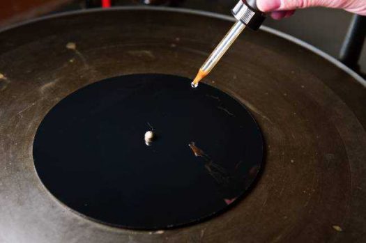 When Baumeister receives an audio file to transfer onto a record, he’ll make adjustments to it on his computer, doing some mastering and equalization. Then he’ll send the audio signal from, as one possible source, an MP3 player through a stereo tuner, with the volume blasting, to the lathe’s cutter head, which will cut the record’s grooves. The polycarbonate is first heated up, using a heat lamp — and a smidge of olive oil is applied to the polycarbonate to smooth the cutting process. Sometimes Baumeister’s two lathes, his Presto K-10 and Presto K-11, are used in tandem to produce records for larger orders.