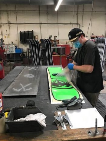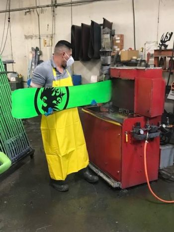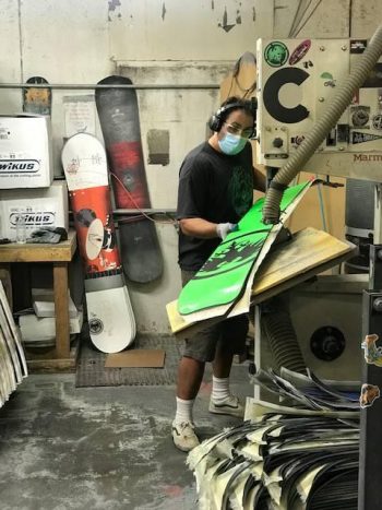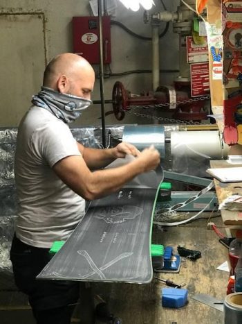 “We were up to 235 units a day. That encompasses all our OEM production. We manufacture for Academy Snowboards, Icelantic Skis, and other brands,” he says. “That’s been reduced to half with the restrictions that are in place right now by the city of Denver. We’re regulated to be at half staff.” He says they retained their senior craftspeople (some of whom can make more than 30 boards a day), but the head count is down from 70 to 35.