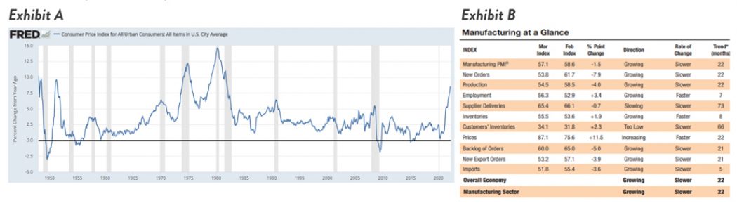 Despite inflation pressures (Exhibit A), recession worries, the War in Ukraine, a restrictive Fed, and the ongoing pandemic, the industrial/manufacturing sector continues to show material strength. For the 22nd consecutive month, the ISM Manufacturing report (Exhibit B) in March showed an expansionary market with a headline reading of 57.1. The Industrial Production Index (Exhibit C) which measures real output for all manufacturing, mining, electric, and gas facilities located in the United States has now fully recovered from the output deficit experienced in 2020.