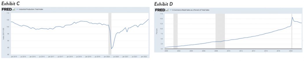 The one data point that seems to have come back to Earth is e-commerce (Exhibit D), but this is a function of people shopping in person more so than what we were seeing during the depths of the COVID pandemic. That said, e-commerce remains elevated as a percent of retail sales compared to the pre-COVID era.