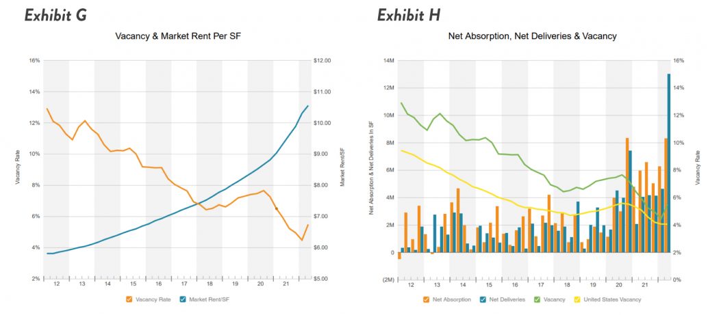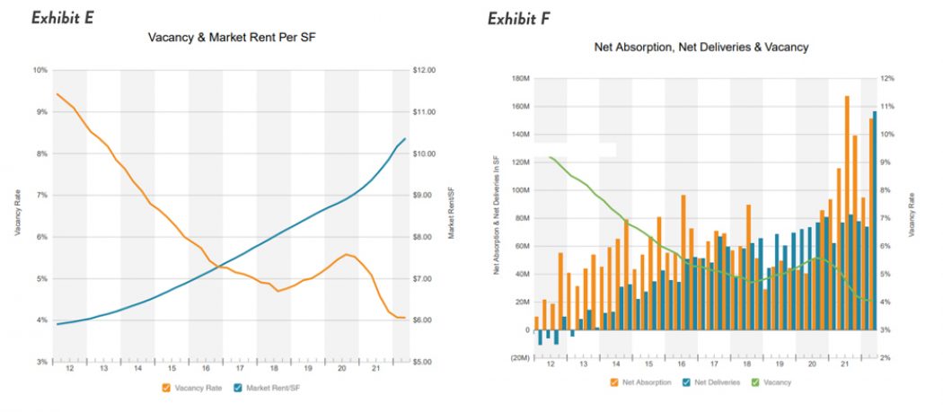 Additionally, with vacancy rates at historic lows (Exhibit E), market rents and net absorption (Exhibit