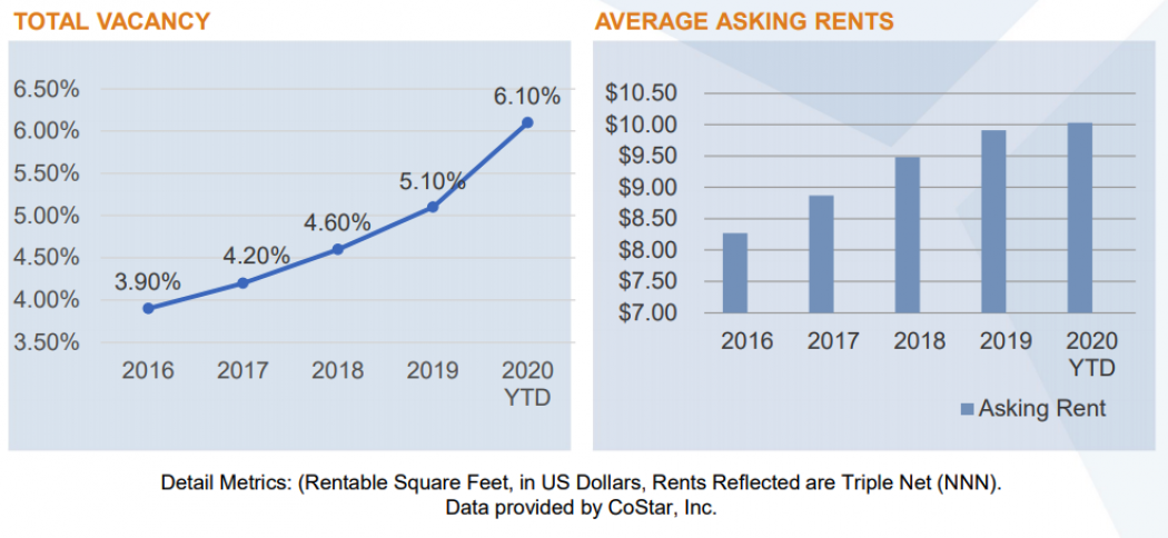 Vacancy rates are above average for Denver at 6.1 percent and things are looking more optimistic in Denver’s industrial markets with 6 million square feet (SF) of deliveries and another 6.2 million SF currently under construction. The new square feet hitting the market contribute to a higher vacancy rate. Even though current rents are near record highs, the annual pace of rent growth has slowed to 1.1 percent. Note this is still positive growth in this period of pandemic, but far from previous annual peak rent growth rates of over 7 percent. The largest lease of 2020 was more than 700,000 SF from Amazon; the largest of Q4 was Victory Packaging at 200,000 SF.