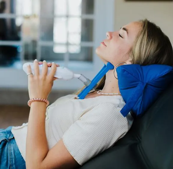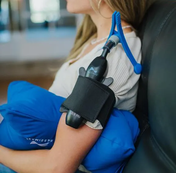Peck points out the device’s assistance in easing distress associated with two different sets of nerves: the vagus nerve in the neck (which helps people heal and relax, he says, hence the sleepy “zz”s in the company’s name) and trigeminal nerve in the face and jaw (which clenches up during the fight or flight response). Using the Pain Tuner Pro II against those areas can reduce migraines and TMJ, he says.