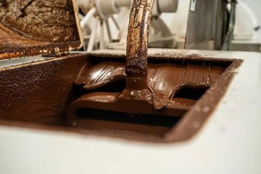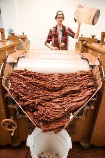 That equipment includes the company’s three-roll mill refiner (built in Brooklyn in the 1950s), which it runs all its cacao through twice in order to get the particles ground down to the smallest size possible. And its longitudinal conch (built in 1915 in Switzerland), which improves the chocolate’s quality over the course of a three-day run.