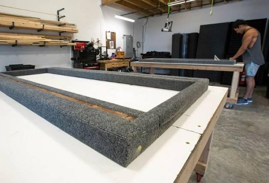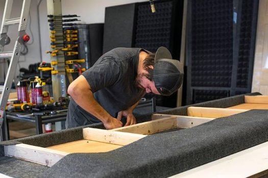 At his 3,000 square feet of rented shop space in West Jordan, Dwyer and his employees build the booths, starting with their wooden frames. The frames then get wrapped with carpeting, the color of which customers get to decide. Next, a sound deadening membrane is added to the walls inside. The next layer is a rigid foam insulation panel. Finally, on top of that, goes the pyramid-shaped acoustic foam.