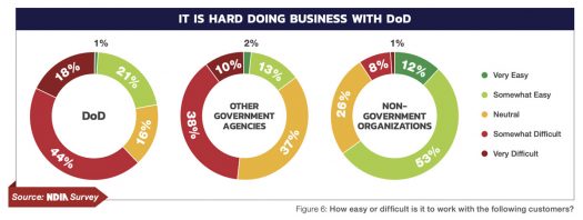 NDIA member surveys drive home the point: companies make it clear that it’s “easier to work with non-government customers than DoD,” and, that “defense companies find it harder to do business with DoD than other federal customers.”